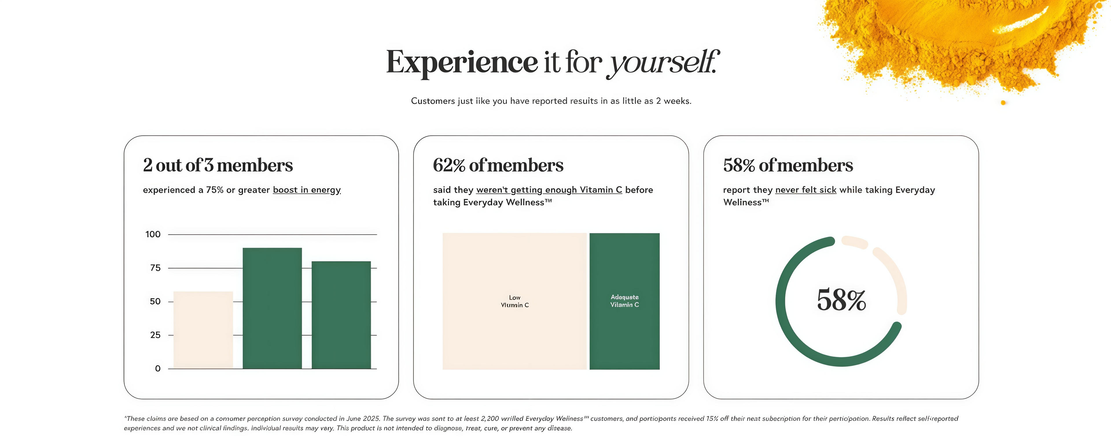 For best results, we highly recommend taking Everyday Wellness™ daily. Consistency is key to getting the most out of the ingredients and supporting your overall health over time.After 6 months of daily use, our customers reported feeling more energized, experiencing less joint pain, and relying less on caffeine or other stimulants. Digestion, immune health, and stress recovery often improve as Everyday Wellness™ becomes a seamless part of your daily routine.